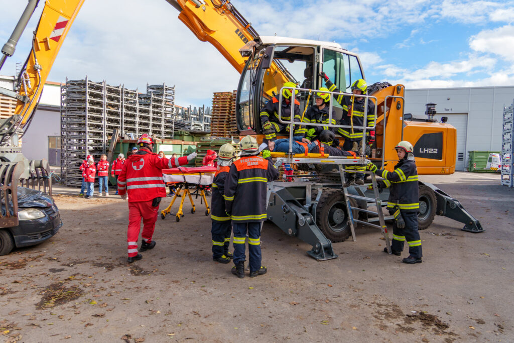Übungsannahme war ein Brand in einem Entsorgungsbetrieb, bei dem sich aber in weiterer Folge beim „in Sicherheit bringen“ ein schwerer Verkehrsunfall zwischen einem Sortiergreifer und einem Pkw ereignete da der Brandschutzbeauftragte wegen der Alarmierung mit seinem Privat-Pkw in die Firma fuhr und diese Beiden frontal Kollidierten.